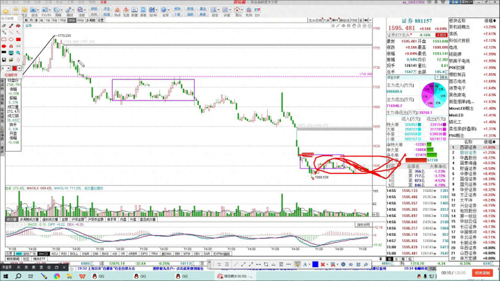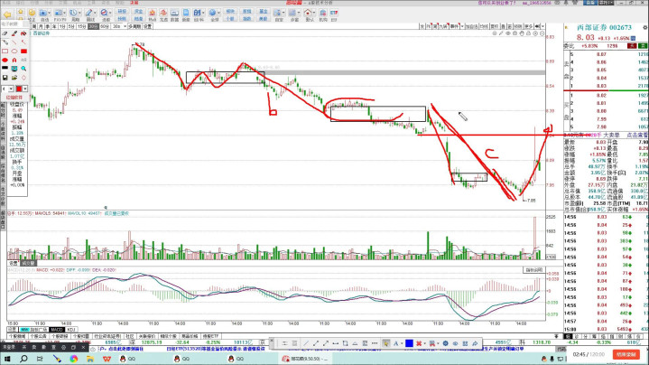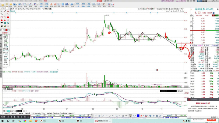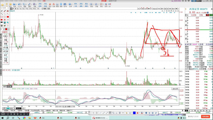 看一下西部正确,今天有一个突然的拉升,看一下它的周线图,中线整体走的还是比较强势的,前面这个位置基本上有一个上眼,前面有个中枢,中枢是向上去做了突破,回踩形成了一个类三本,类似于三本,所以这个位置再次反攻,向下这样的走势,所以可能会在这个位置当成一个对称正当来走。
